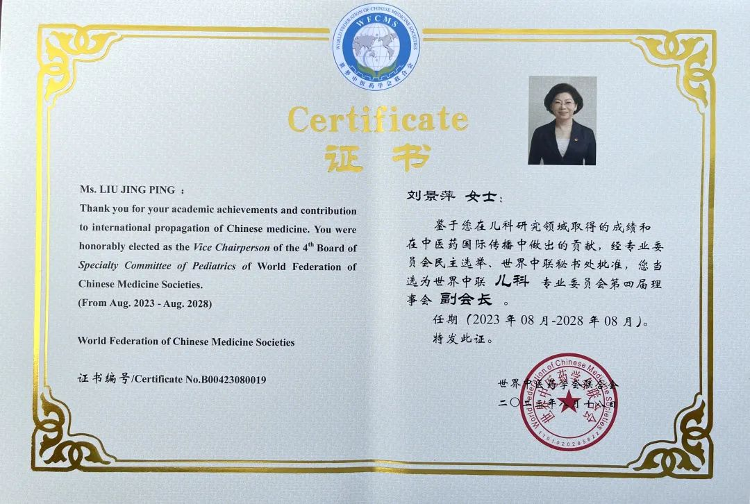 SG胜游药业集团党委书记、董事长刘景萍当选世界中医药学会联合会儿科专业委员会第四届理事会副会长